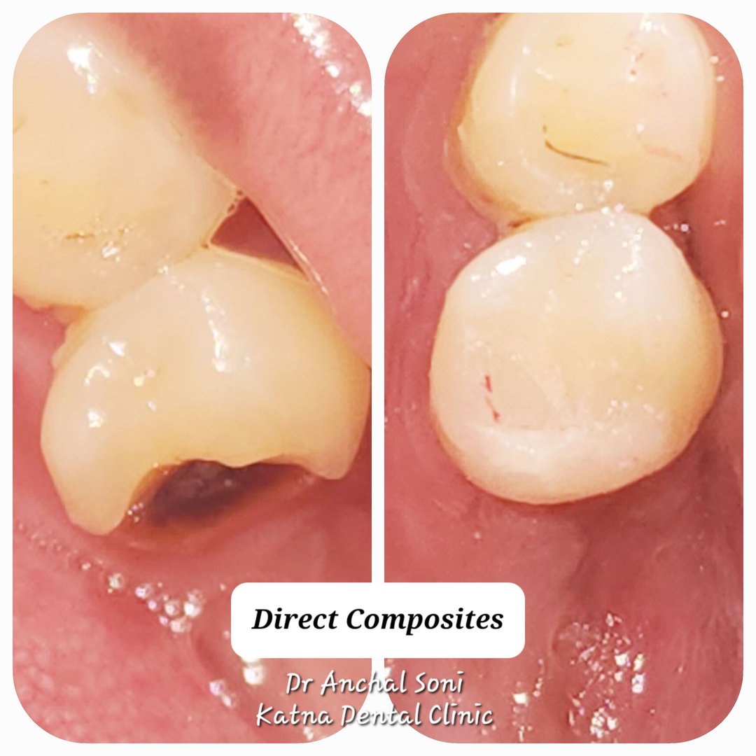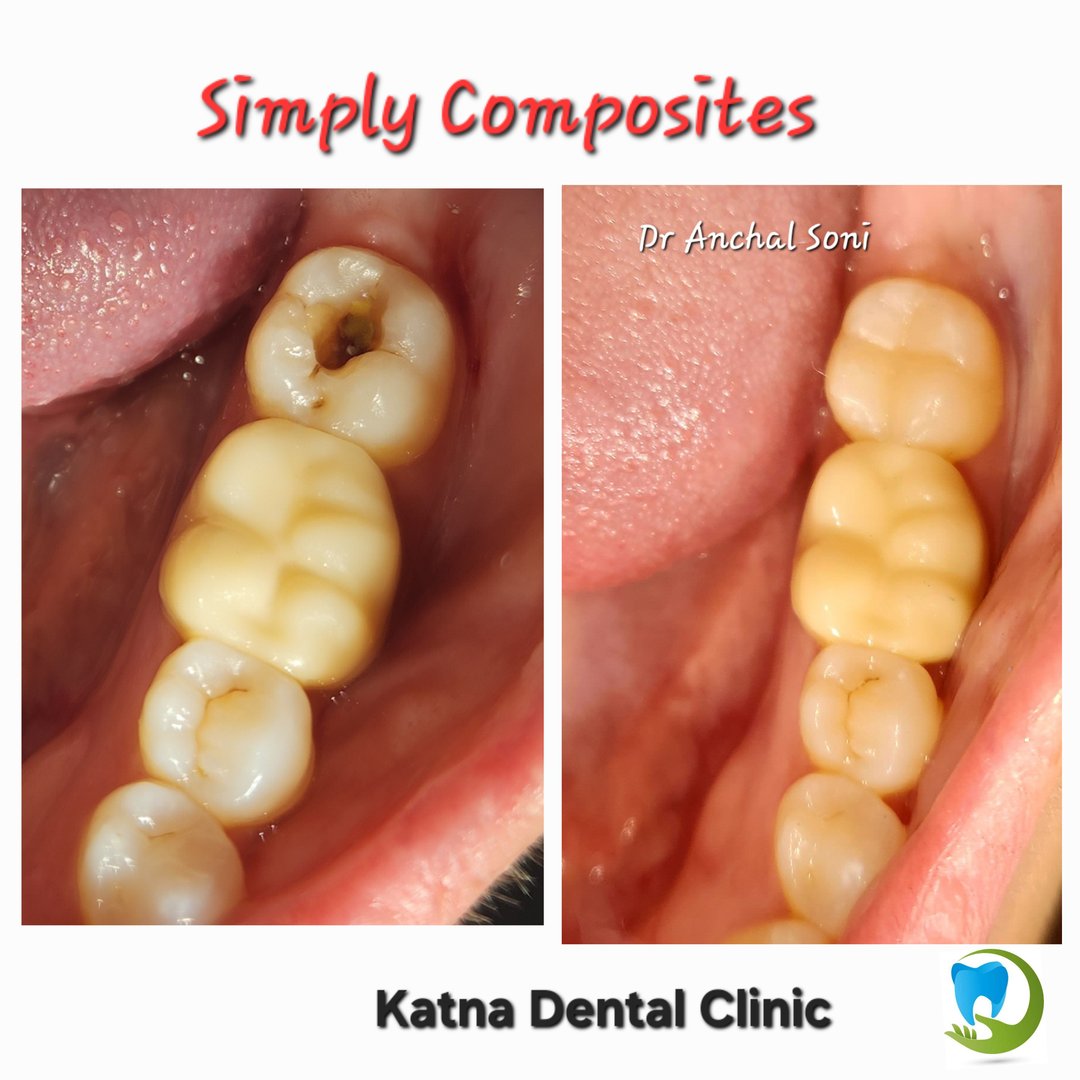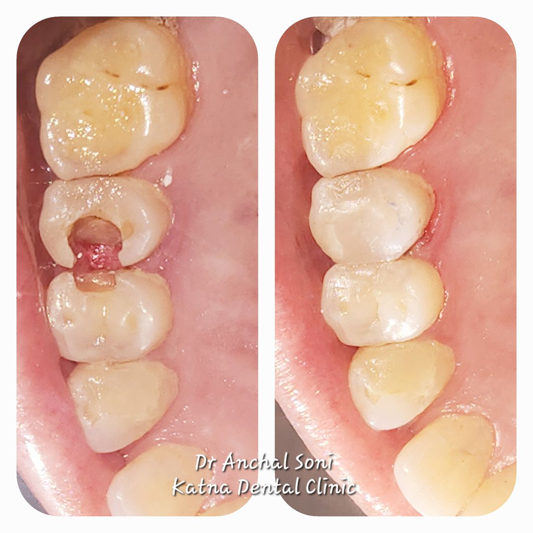 Before and after dental restoration treatment at Katna Dental Clinic, showing the repair of a decayed tooth and restoration of its natural function a…