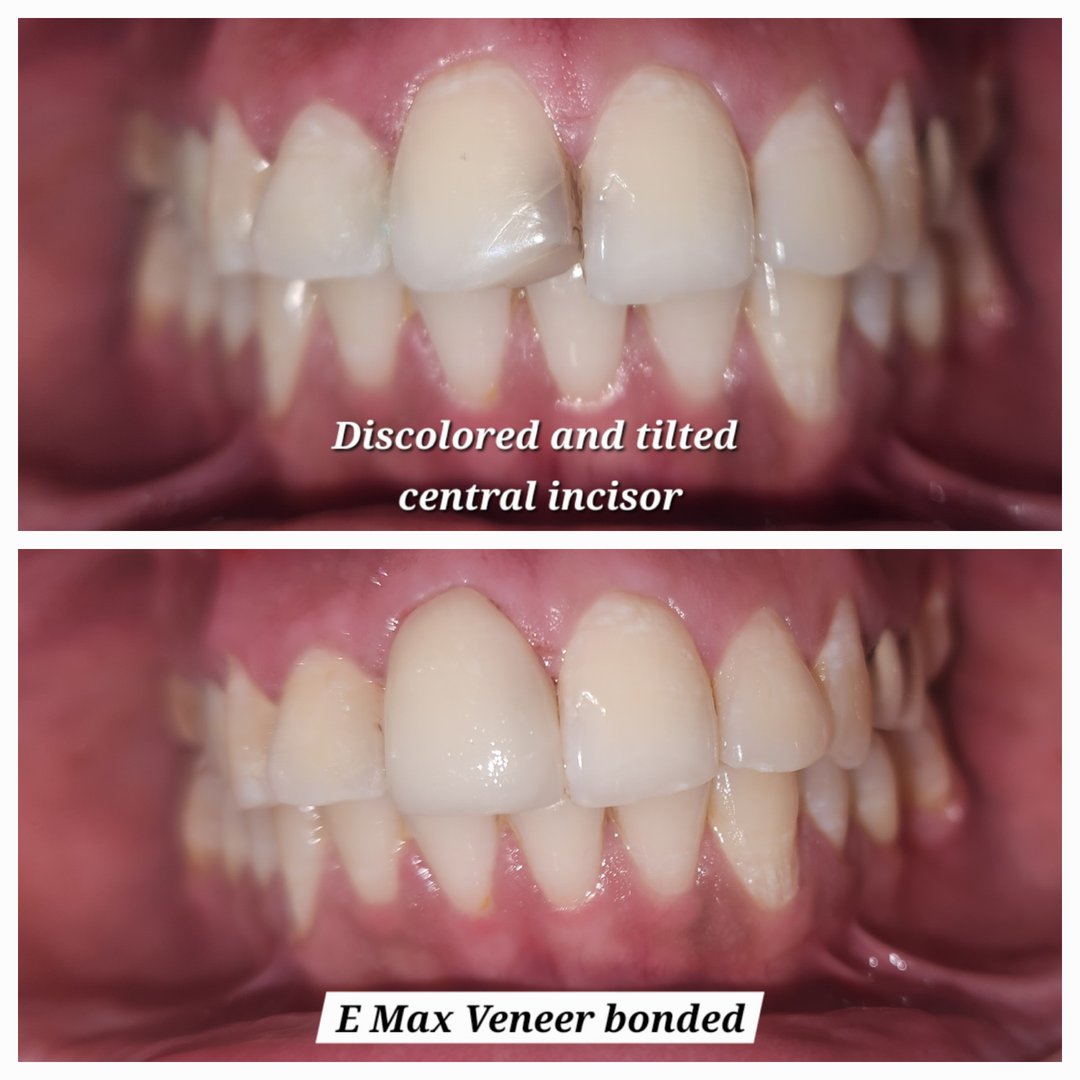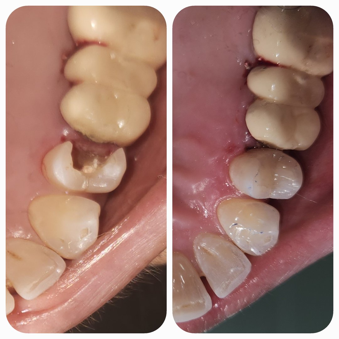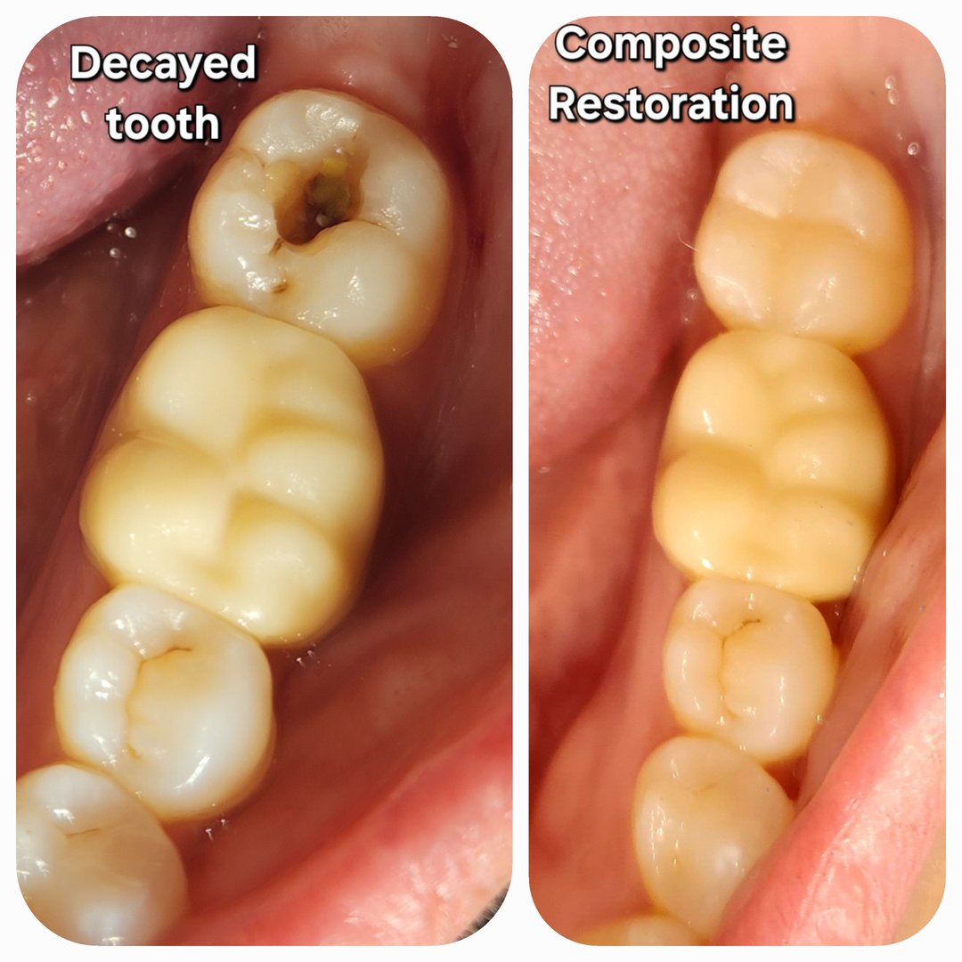Before and after dental restoration treatment at Katna Dental Clinic, showing the repair of a decayed tooth and restoration of its natural function a…